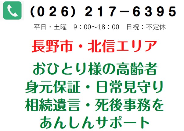 可児猛事務所は、行政書士や司法書士など、士業をメインとした身元保証事業の全国組織である「一般社団法人身元保証相談士協会」「一般社団法人いきいきライフ協会北信」「一般社団法人あんしん財産管理支援機構」と提携を結び、長野市・北信エリアの「おひとり様終活」を積極的にサポートしています。また、サポートのために必要な預託金(100万円~200万円)は、外部の信託口座に預けるため、当事務所で一切預かることはなく、当事務所への寄付行為も固くお断りしています。