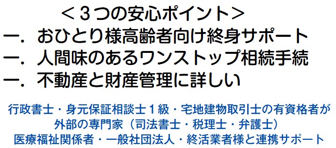 相続遺言など、終活サポートの専門性はもちろんのこと、不動産や預貯金を中心とした財産管理・財産処分の適切なご提案ができること、おひとり様高齢者向けの、安全で高品質なサポート体制を、士業メインの全国的な身元保証団体と提携しながら整えていること、相続・医療・介護の外部専門家(司法書士、税理士、弁護士、ケアマネージャー、ソーシャルワーカー、一般社団法人、介護福祉施設、医療施設など)と、案件ごとにチームを組んで、ワンストップで取り組むことが、当事務所の強みです。
