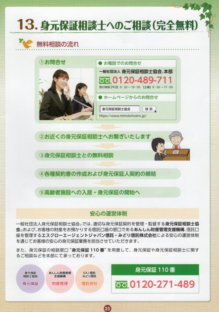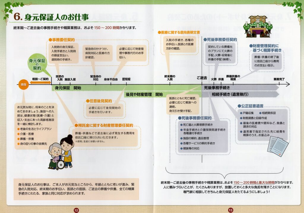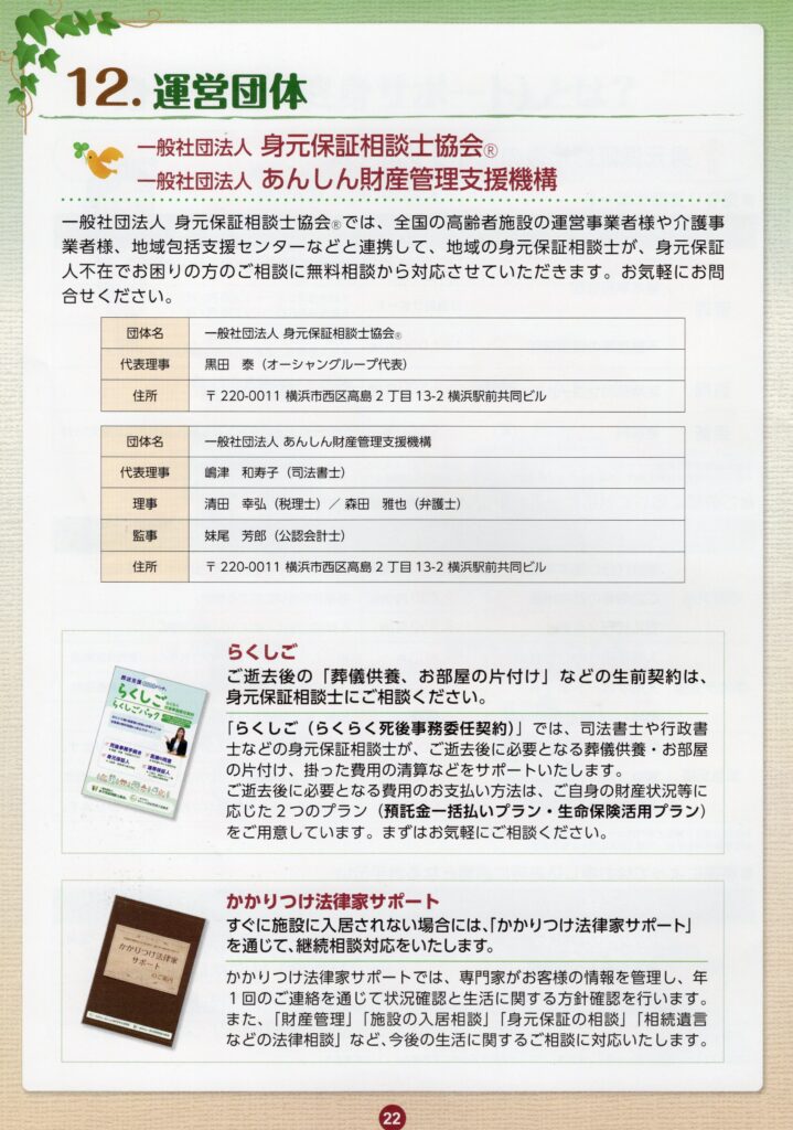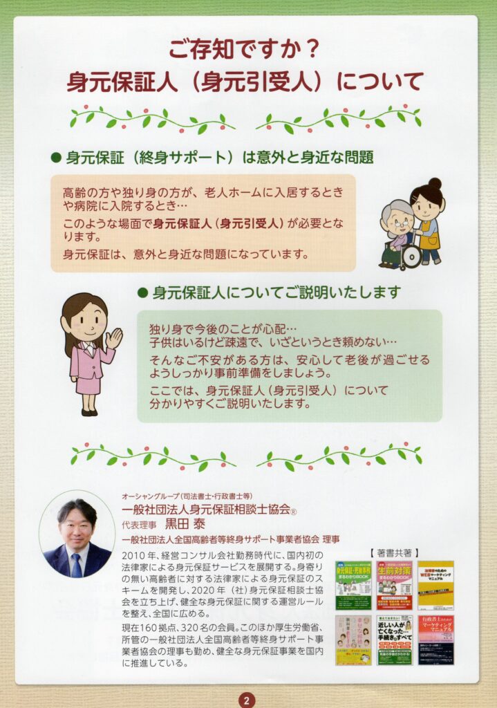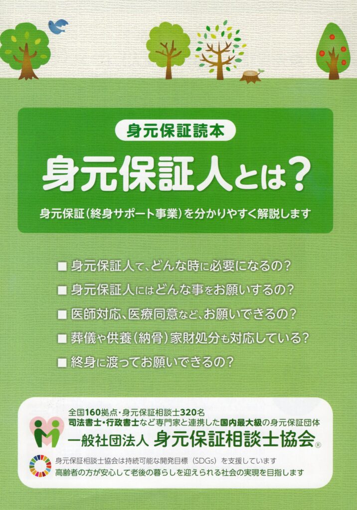 行政書士可児猛事務所は、法律家(士業)によって立ち上げられた全国最大級の身元保証団体である「一般社団法人身元保証相談士協会」および「一般社団法人いきいきライフ協会北信」と連携し、独自の身元保証サービスを提供しています。(パンフレット「身元保証読本」参照)