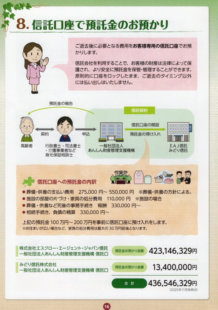 (2)預託金は外部の信託口座に預けるため、当事務所や提携先の一般社団法人は一切預からない(倒産隔離機能あり)。信託費用も低額。