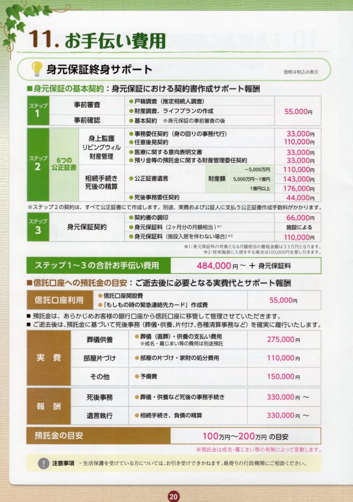 大まかですが、身元保証や日常見守りの業務報酬は「60万円~80万円(契約期間による)」、預託金は「100万円~200万円」が目安です。葬祭保険などの生命保険を活用した場合、預託金は不要となります。緊急時対応や死後事務に特化した60万円位からのシンプルなプランもございます。